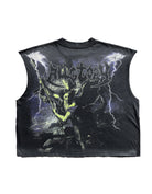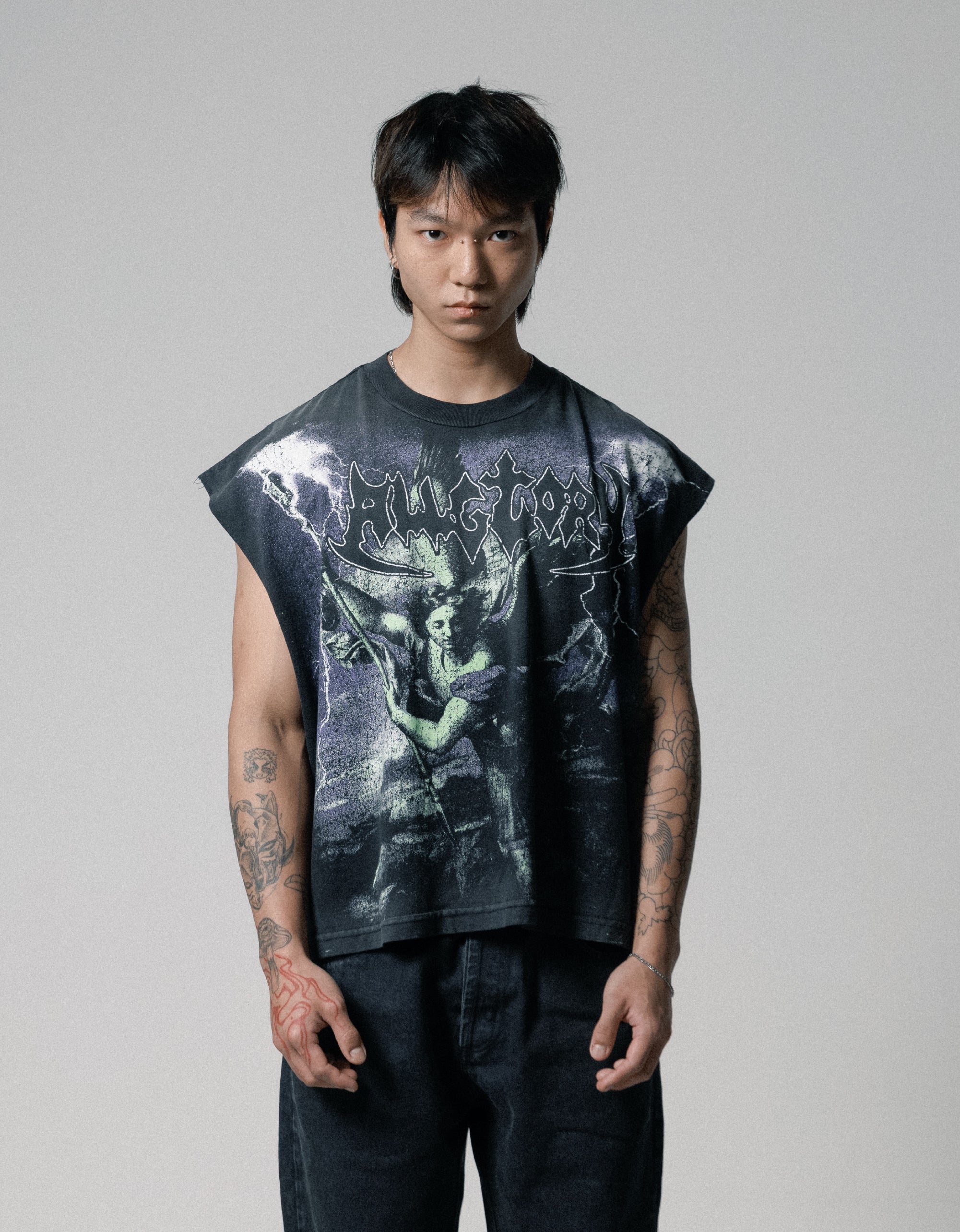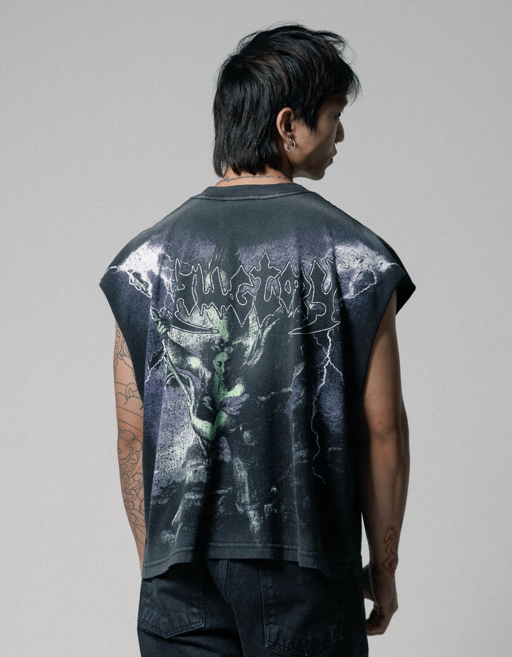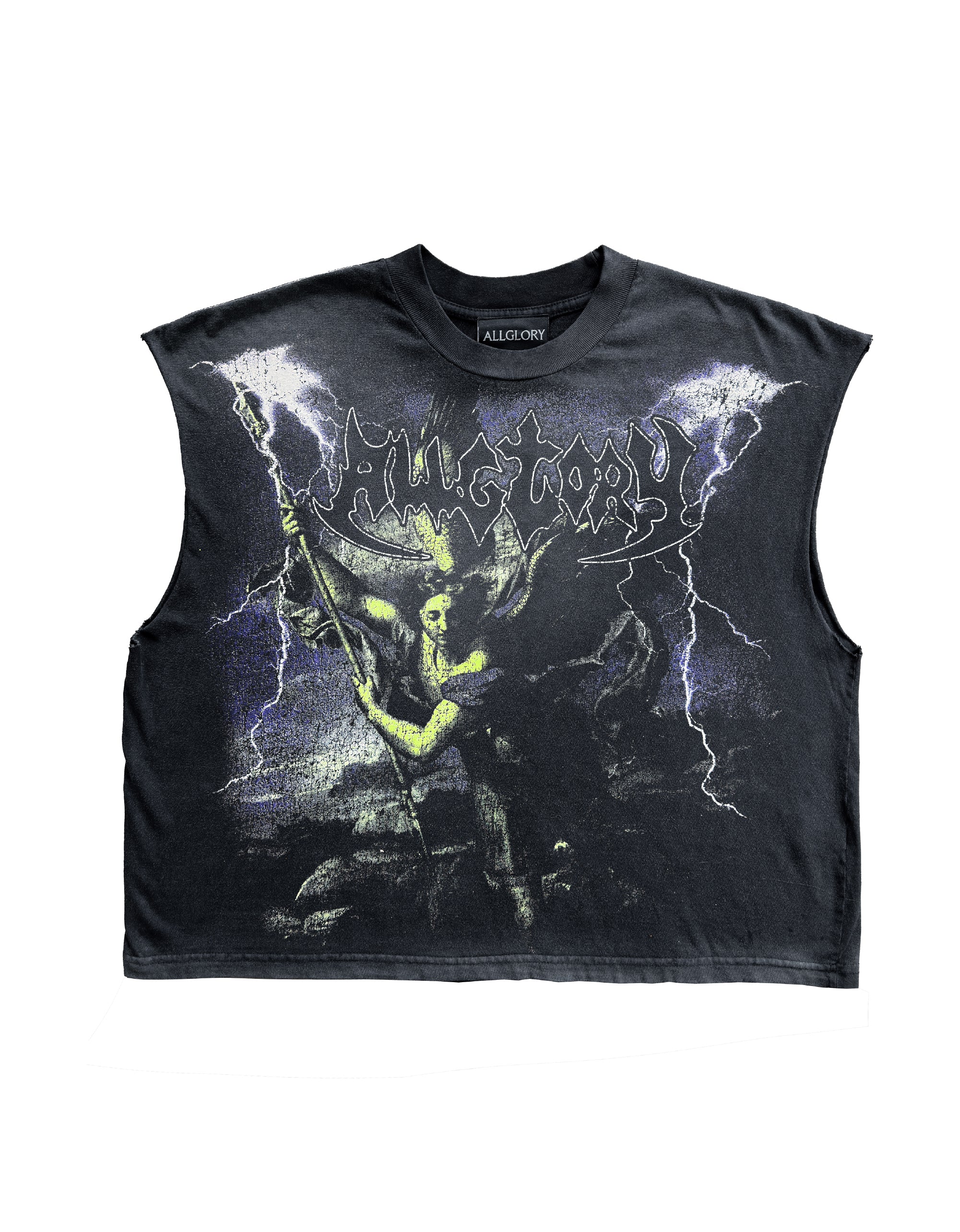 DEFEATING Regata ALLGLORY Washed Black unissex estampada individualmente a mão na frente e nas costas. Modelagem Muscle Tee Boxy exclusiva inspirada nos anos 90.
